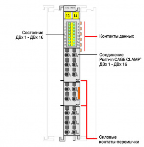 Модуль имеет соединение Push-in CAGE CLAMP®, что позволяет вставлять непосредственно в него одножильные проводники.