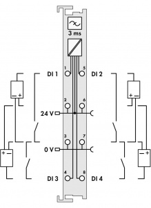 750-408/025-000 Модуль, 4 дискретных входа; тока; 3 мс; Включение по низкому уровню; Внешняя температура