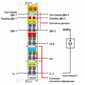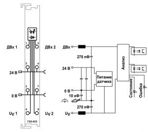 Подача питающего напряжения к каждому из каналов датчиков осуществляется от защищенного от короткого замыкания источника напряжения 8,2 В. Короткое замыкание или обрыв линии отображается в образе процесса (1 бит) и с помощью красного светодиода.