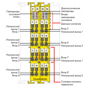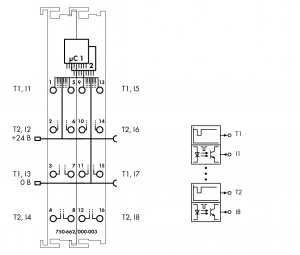 Модули имеют 8 синхронизируемых вводов (I1 - I8), питание на которые подается от 2 выводов с разной синхронизацией (T1 - T2).