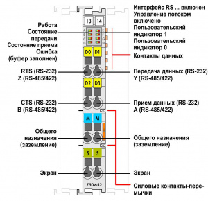Модуль последовательного интерфейса подключает устройства с интерфейсом RS?485/422 или RS?232 к системе WAGO?I/O?SYSTEM 750. Он также служит шлюзом между последовательным интерфейсом и системами полевых шин, поддерживаемыми WAGO?I/O?SYSTEM 750. Модуль не требует более высокого уровня протокола. Обмен информацией происходит полностью прозрачно для управляющего устройства полевой шины, благодаря чему существует большое количество сфер применения для модуля последовательного интерфейса. При необходимости протоколы связи могут быть сконфигурированы посредством управляющего устройства полевой шины.