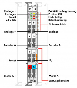 Этот модуль представляет собой 1-канальное интеллектуальное устройство позиционирования для электродвигателей постоянного тока на 24 В с током до 5 А с обратной связью по приращениям.