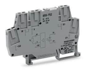 —859-752 Модуль оптопары; Номинальное входное напряжение: 5 В пост.тока; Диапазон выходного напряжения: 0 - 24 В пост.тока; Предельный длительный ток: 0,5 А; Частота: 10 кГц