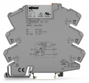 —857-357 Релейный модуль; Номинальное входное напряжение: 115 В перем./пост.тока; 1 перекл. контакт; Предельный длительный ток: 6 А; Желтый индикатор состояния; Ширина модуля: 6 мм