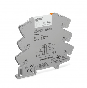 —857-304 Релейный модуль; Номинальное входное напряжение: 24 В пост.тока; 1 перекл. контакт; Предельный длительный ток: 6 А; Желтый индикатор состояния; Ширина модуля: 6 мм