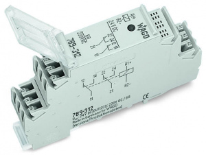 —789-312 Релейный модуль; Номинальное входное напряжение: 24 В пост.тока; 2 перекидных контакта; Предельный длительный ток: 8 А; Красный индикатор состояния; Ширина модуля: 18 мм