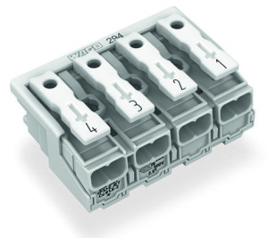 —294-4044 Соединитель для светильников; нажимная кнопка, внешняя; без заземляющего контакта; 4-пол.; Стор. свет.: для одножильных проводников; Инст. стор.: для всех типов проводников; макс. 2,5 мм2; Темп. окруж. среды: макс. 85 °C (T85)