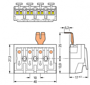 —294-4214 Соединитель для светильников; нажимная кнопка, внешняя; с защелкивающимся заземляющим контактом; 4-пол.; Стор. свет.: для одножильных проводников; Инст. стор.: для всех типов проводников; макс. 2,5 мм2; Темп. окруж. среды: макс. 85 °C (T85)