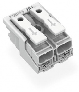 —294-5002 Соединитель для светильников; нажимная кнопка, внешняя; без заземляющего контакта; 2-пол.; Стор. свет.: для одножильных проводников; Инст. стор.: для всех типов проводников; макс. 2,5 мм2; Темп. окруж. среды: макс. 85 °C (T85)