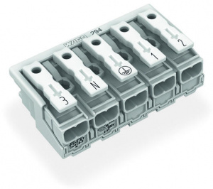 294-5055 Соединитель для светильников; нажимная кнопка, внешняя; без заземляющего контакта; 5-пол.; Стор. свет.: для одножильных проводников; Инст. стор.: для всех типов проводников; макс. 2,5 мм2; Темп. окруж. среды: макс. 85 °C (T85)