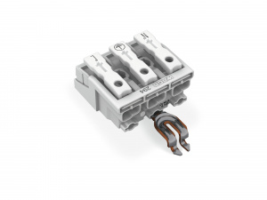 —294-5323 Соединитель для светильников; нажимная кнопка, внешняя; с защелкивающимся заземляющим контактом углового исполнения; 3-пол.; Стор. свет.: для одножильных проводников; Инст. стор.: для всех типов проводников; макс. 2,5 мм2; Темп. окруж. среды: мак