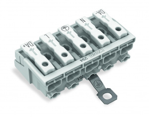 —294-5475 Соединитель для светильников; нажимная кнопка, внешняя; с винтовым заземляющим контактом; 5-пол.; Стор. свет.: для одножильных проводников; Инст. стор.: для всех типов проводников; макс. 2,5 мм2; Темп. окруж. среды: макс. 85 °C (T85)