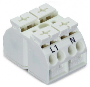 862-1632 ПОД ЗАПРОС 4-проводная клеммная колодка с монтажными штифтами; 2-пол.; L1-N; без заземляющего контакта; 1 защелкивающаяся ножка для крепления на контакт; 4 mm2