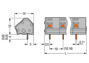 236-302 Клемма на печатную плату; 2,5 мм2; Шаг контактов 10/10,16 мм; 2-пол.; CAGE CLAMP; опция объединения