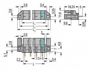—232-733/047-000 Розетка под пайку THT; 0.6 x 1.0 mm solder pin; угловые; Проходной фланец; Шаг контактов 7,5 мм; 3-пол.